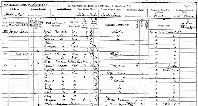 The Castle Hotel was built in the early 1850s on Gregson Lane, on the west side of the tenement farmhouses, later known as Hatherlow Farm (see photo below), which these days are private residences. The 1844 OS map clipping below shows the farm buildings before the inn was built, situated below the 'r' of Gregson Lane. First reference to the inn is found on the 1861 census below, although I suspect it was opened in the mid-1850s.